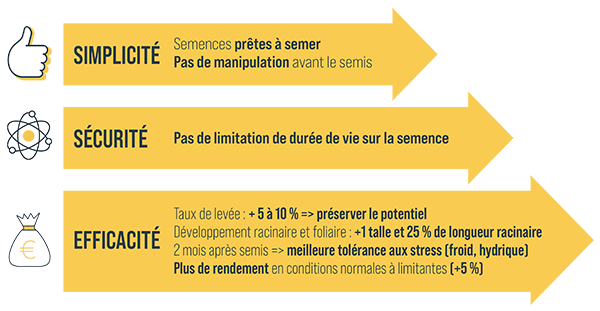 The biostimulant is applied directly around the seed. It is composed of nutrients: amino acids, plant extracts, minerals, etc. The Fortify biostimulant helps to reduce the causes of induced deficiency, by positioning the elements as close as possible to the roots. This stimulates the roots, ensures more uniform emergence, increases tolerance to stresses and consequently better establishment.
